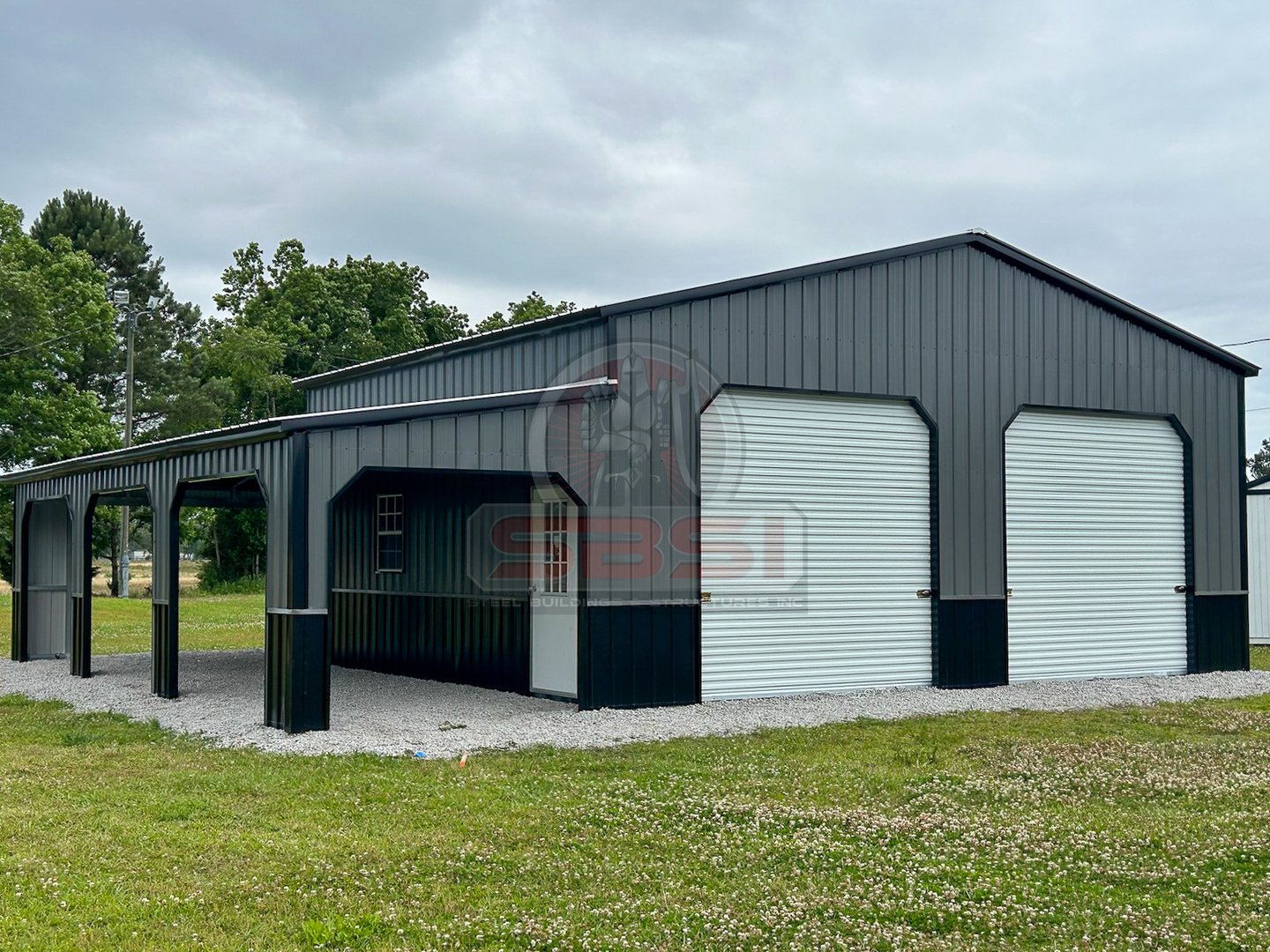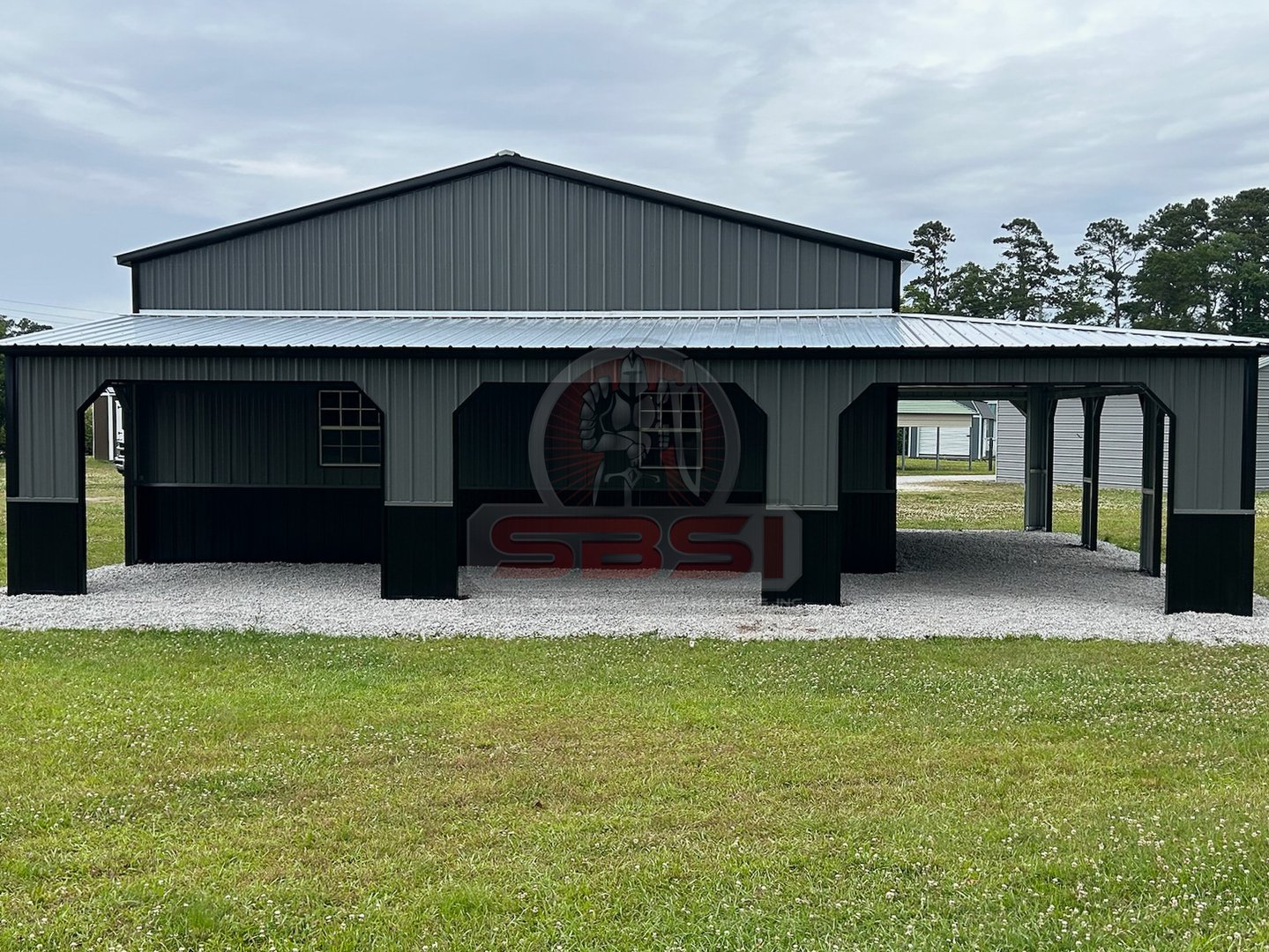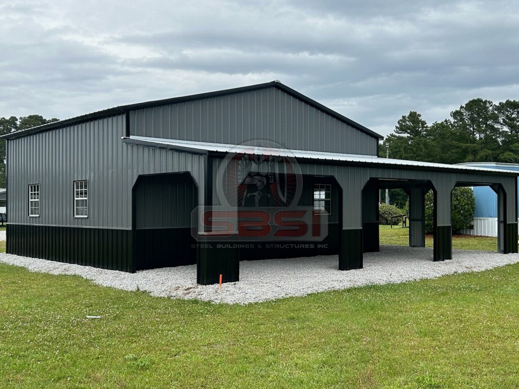 Todas las construcciones de SBSI son personalizadas para el cliente. Adapte su garaje de metal para reflejar su estilo personal con nuestra gama de opciones de personalización. En este proyecto, el cliente optó por un elegante techo Galvalume para complementar los colores y el diseño general. Mientras que las 10 aperturas de la puerta del garaje, cada una con esquinas holandesas, proporcionaban cómodas opciones de acceso y ventilación. Además, siete ventanas estratégicamente situadas y una puerta de acceso ofrecen luz natural y una entrada fácil a este espacio de trabajo.